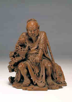 竹根色呈棕黄。作者以鏤雕、圆刻等多种技巧,将一位高挽束髻、长髯、清惧而强健的采药老人栩栩如生地表现出来。老人足蹬草履,药锄旁置,曲膝低首,目视下方,面带微笑坐於玲瓏的山石上,似小憩,又似凝思。老人手扶的花篮中满盛硕果,有寿桃、灵芝和仙草,隐寓「群仙祝寿」之意。