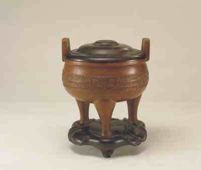 竹鼎圆形,腹外有一圈回纹地饕餮纹装饰带,鼎盖及三足荷叶底座為紫檀木制。盖钮以蜜蜡雕成,刻兽面纹及蕉叶纹。