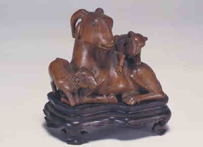 作者以写实的雕刻手法将三羊母子亲暱的神态表现出来。两只小羊,一只顽皮好动,一只温和沉静,母羊则泰然自若。此作品系仿竹根雕三羊镇纸而刻制。